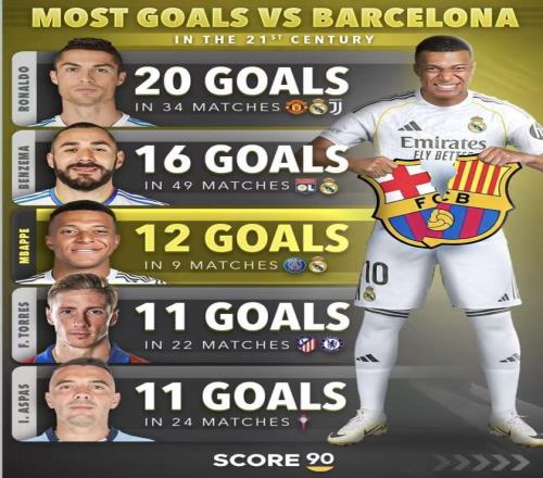 2025年10月26日的国家德比,姆巴佩第22分钟率先破门,皇马2-1击败巴萨。 这球进完,他对巴萨的对阵数据被刷新成9场12球,场均1.33球。 把这组数字放进“21世纪对巴萨进球最多”的那张榜单里看,姆巴佩在场均进球这一项排在最前面——从这张榜单的前排名字看,巴萨这些年最头疼的,是不是一直都是皇马?