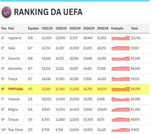 此外,葡萄牙仍有机会在下个赛季获得三个欧冠正赛名额。然而,这一前景较为悲观,要获得欧足联分配的额外名额,葡萄牙必须成为2025-26赛季积分排名前两名的协会之一。