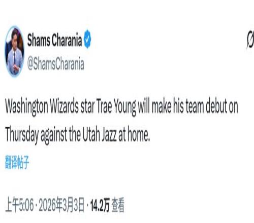 北京时间3月3日,据名记Shams报道,华盛顿奇才队控球后卫特雷-杨预计将在周五对阵犹他爵士的比赛中完成新球队首秀。特雷-杨自2025年12月28日起因膝盖与股四头肌伤势一直缺阵。他是在2026年2月交易截止日前被交易至奇才队的。